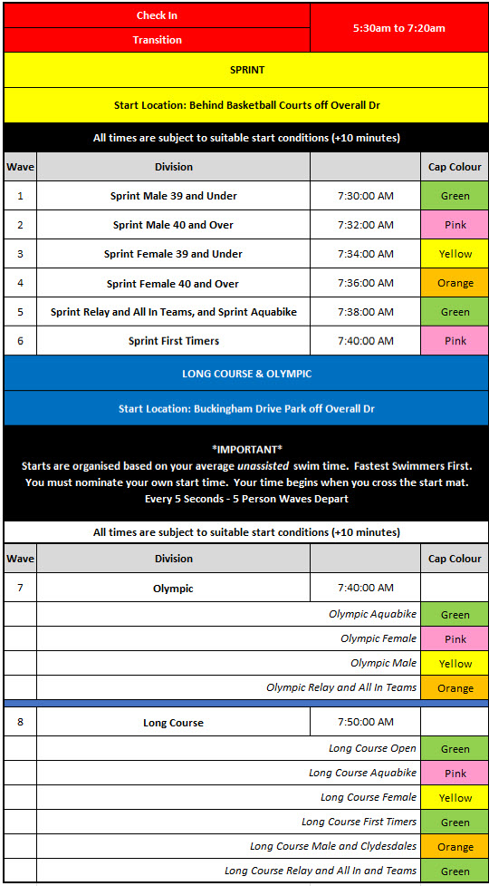 Registration is planned to open on Friday afternoon from 4.00 PM – 7.00 PM at Philip Street Park. If you can’t make it on Friday afternoon, you can sign on and rack on the day from 5.30 AM and until 10 minutes prior to first wave.